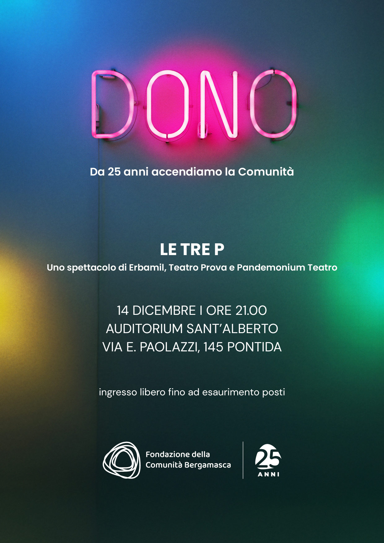 Lo spettacolo, dedicato al tema del dono, è stato commissionato dalla Fondazione della Comunità Bergamasca in occasione del 25° anniversario della sua attività. Attraverso il linguaggio del teatro verranno approfonditi temi quali la filantropia intesa come costruzione di legami, cura reciproca e partecipazione condivisa: valori che appartengono alla vita quotidiana e alla storia della nostra comunità.